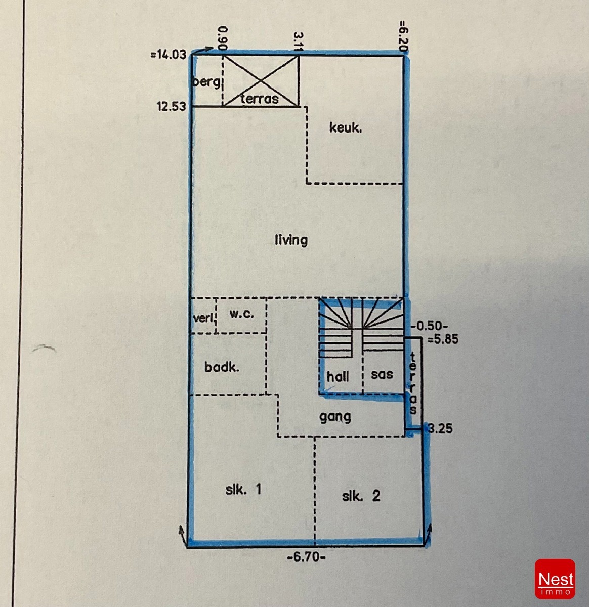 Opbrengsteigendom met 2 appartementen, bestaande uit ondergronds twee garages, drie kelders , een teller-lokaal en een stookplaats. Aansluitend op dit niveau bevindt zich een gezellige stadstuin, ook bereikbaar via de zijkant van het huis. Op het gelijkvloers is er één vergund appartement met twee slaapkamers en een terras aan de achterkant, dat momenteel verhuurd is. Op de eerste verdieping is er een tweede vergund appartement met twee slaapkamers en een terras aan de achterkant, momenteel eveneens verhuurd. De tweede verdieping bestaat uit een zolder, omgebouwd tot een dakappartement met één slaapkamer met mogelijkheid tot domiciliëring, momenteel ook verhuurd.